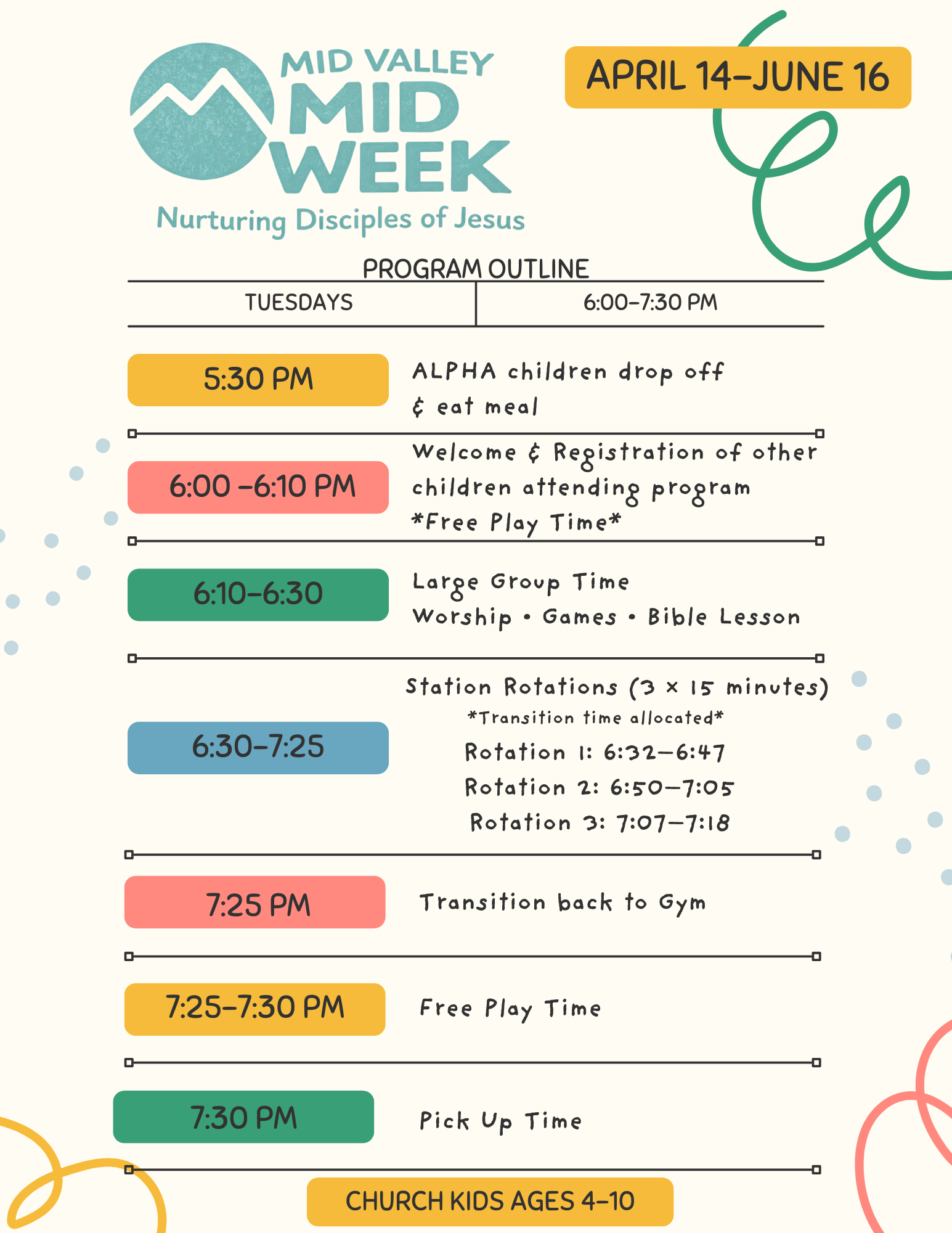 Provide consistent mid-week discipleship for Pre-Primary to Grade 5 through Scripture, prayer, worship, and community